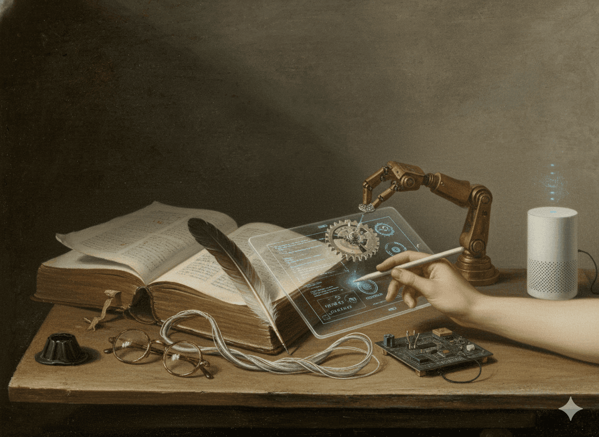 (Image: A diagram showing a user at a desk, focused on writing. In the background, a subtle AI interface connects nodes of information and surfaces a relevant insight in a small, non-intrusive window next to the user's document.)