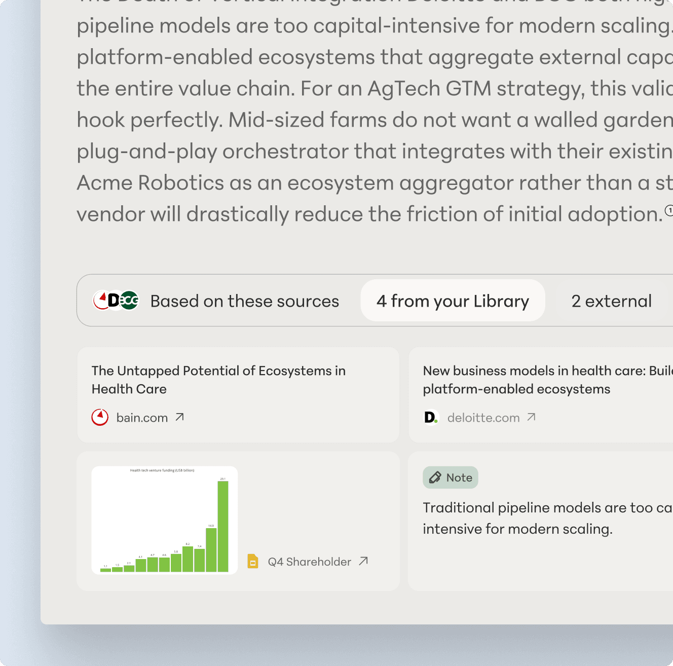 Save articles, reports, PDFs, AI chats, and videos with one click while you browse. Add your own notes and context as you read, so your research captures your thinking, not just the source material. Set up a watchlist for any client or project and Liminary keeps monitoring for new information so you don't have to.